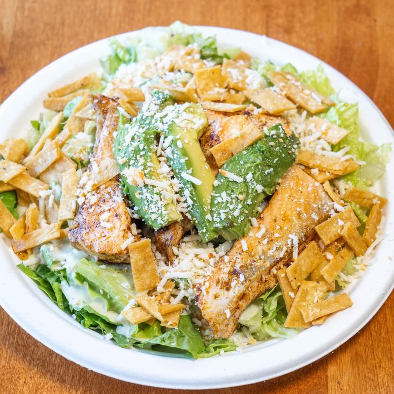 Fresh-cut romaine lettuce and tomatillo Caesar dressing with avocado, cotija cheese, and crispy tortilla strips | Serves 10-20 People.