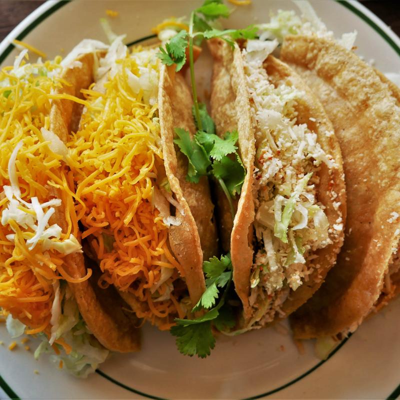 Beef, Chicken, Turkey, or Potato Tacos. Topped with lettuce & cheese.